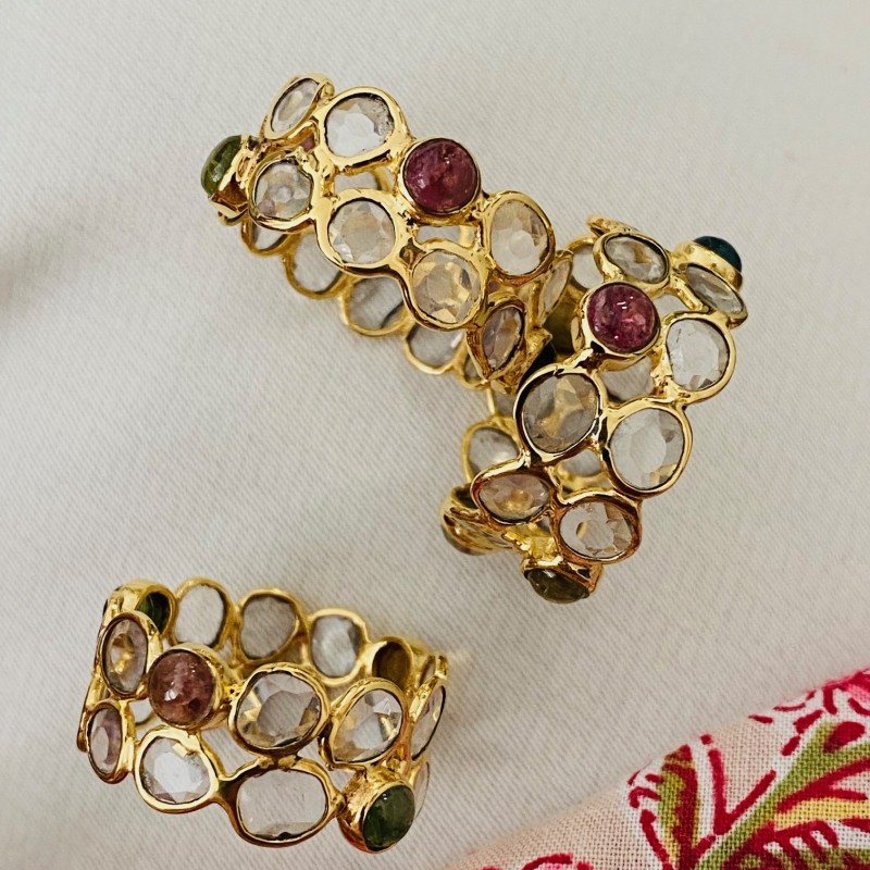 Gold plated ring with polki crystal and tourmaline cabochon.