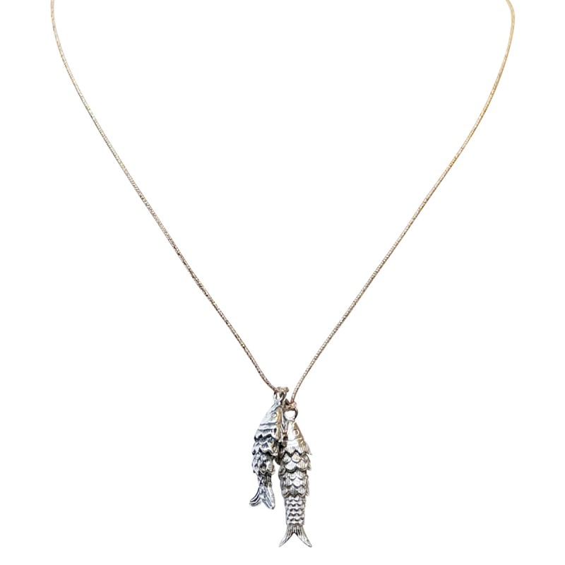 Collier sur fil lurex ou chaine en argent de 45cm , assorti de deux poissons articulés en argent